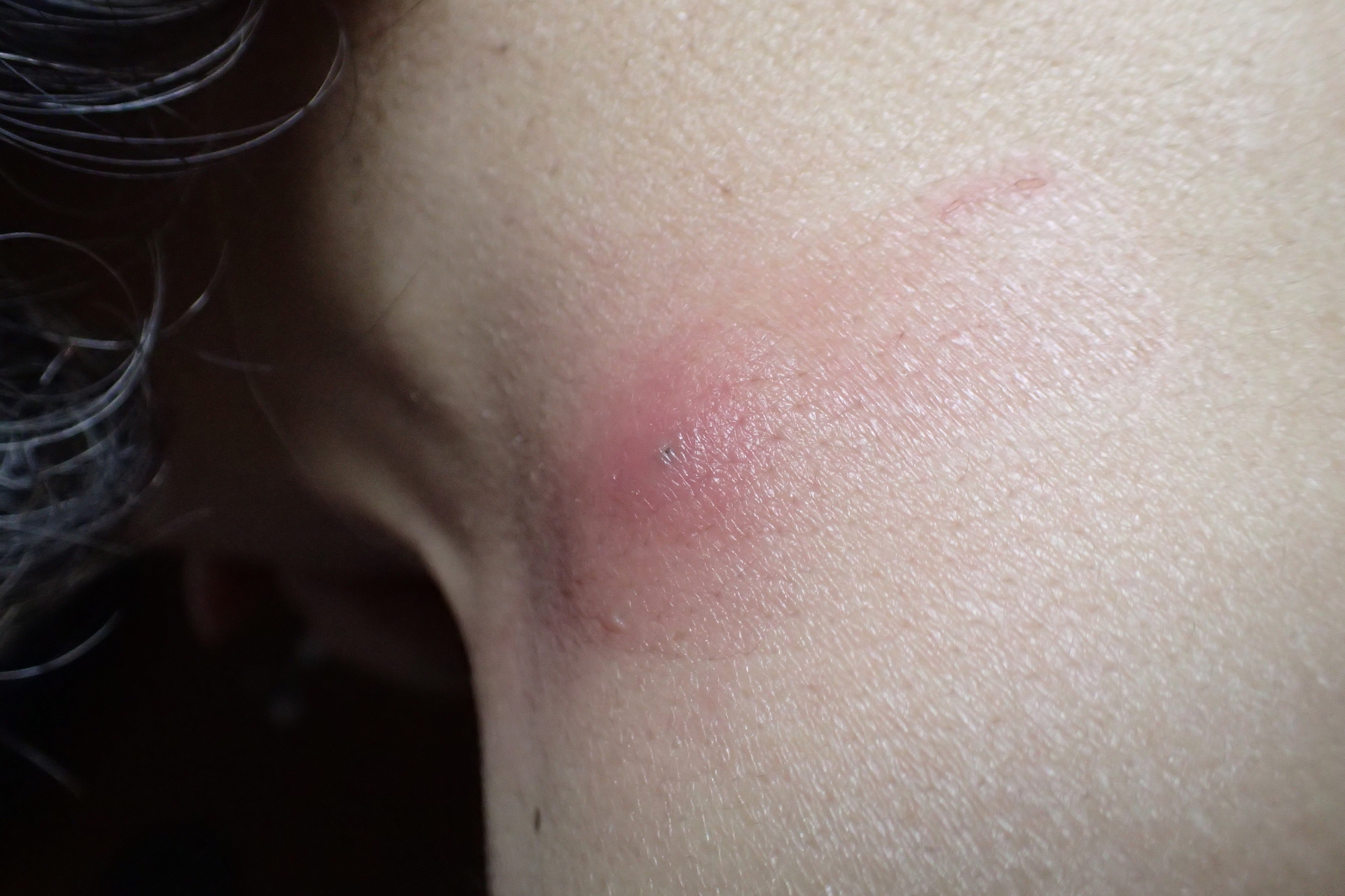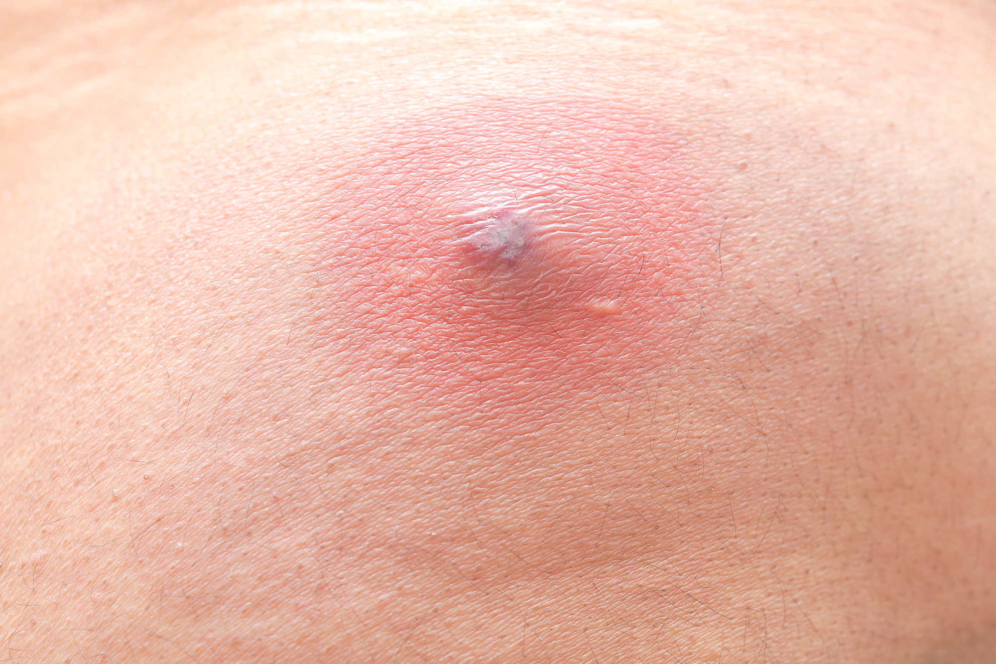 赤く膨らむ見た目はよく似ていますが、粉瘤の場合は中央に黒い点(開口部)が認められることがあります。