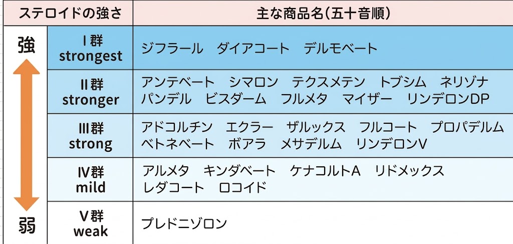 ステロイド外用薬は効果の強さによって5段階に分類されています。