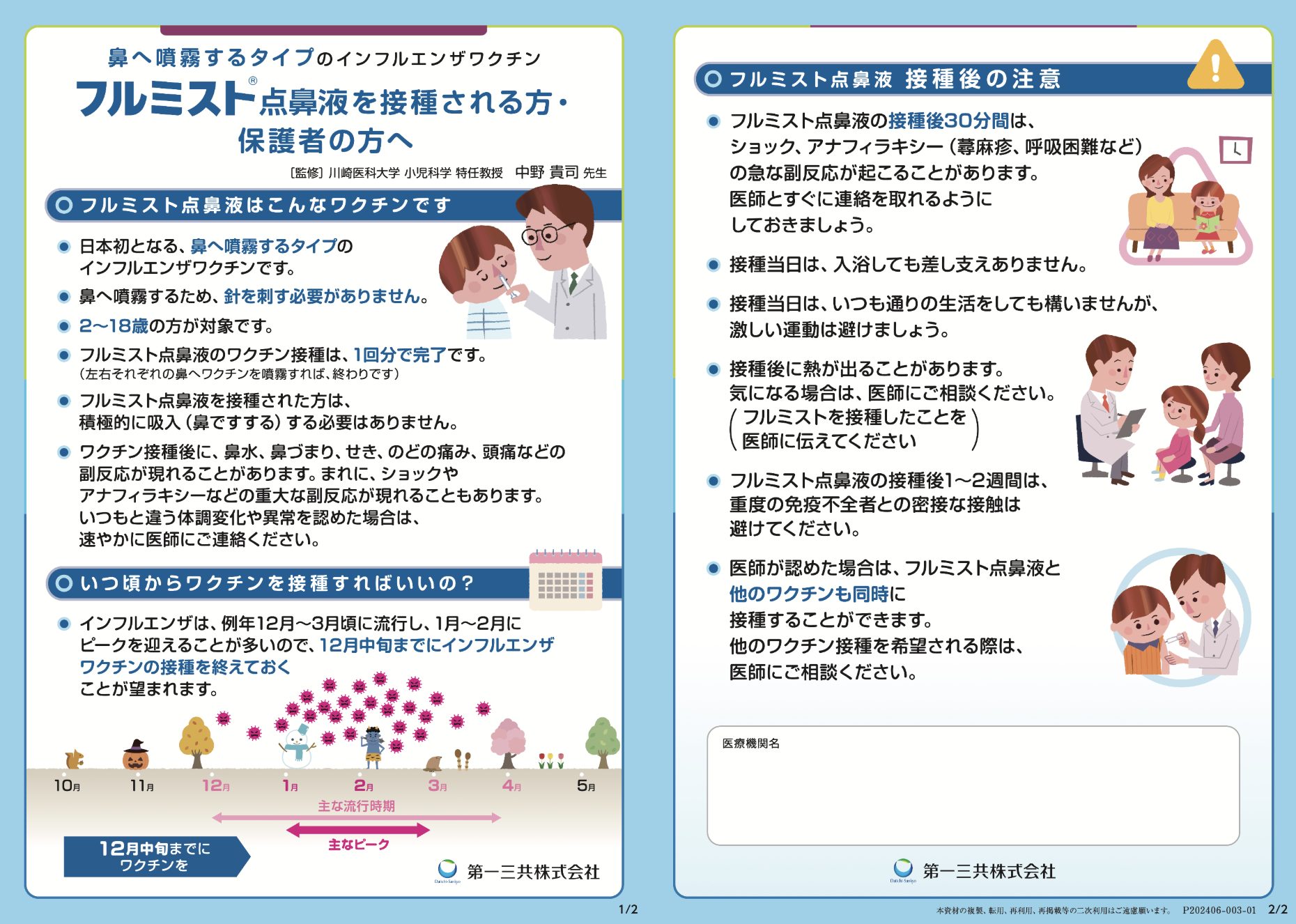 今年は経鼻生インフルエンザワクチン(フルミスト点鼻液)による接種も行います。 - 9月18日(木)14時頃から予約受け付けを開始いたします。